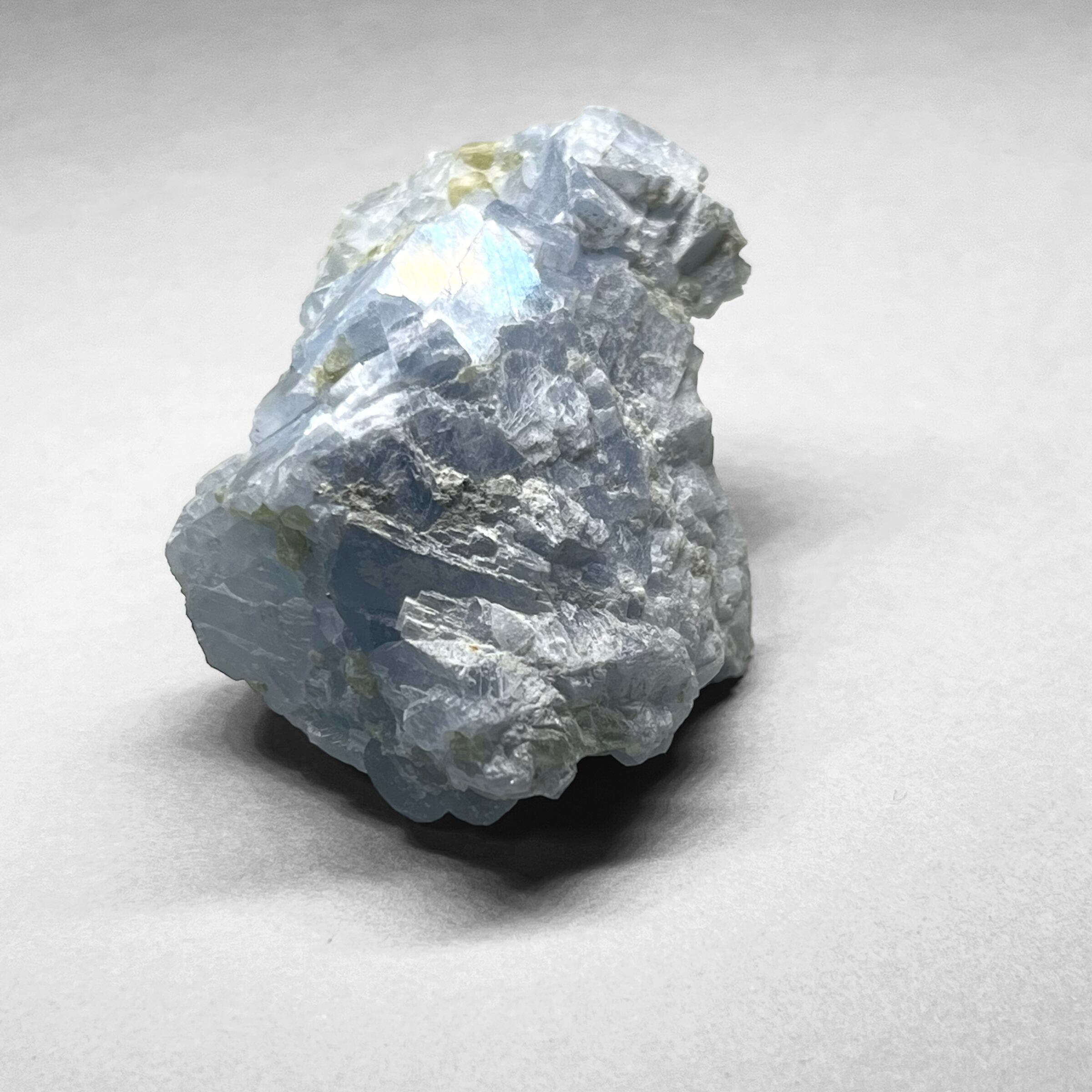 名前の由来:カルサイトは主成分であるカルシウムのラテン語「caix」が由来。青い発色はカストロンチウムが含まれているため。