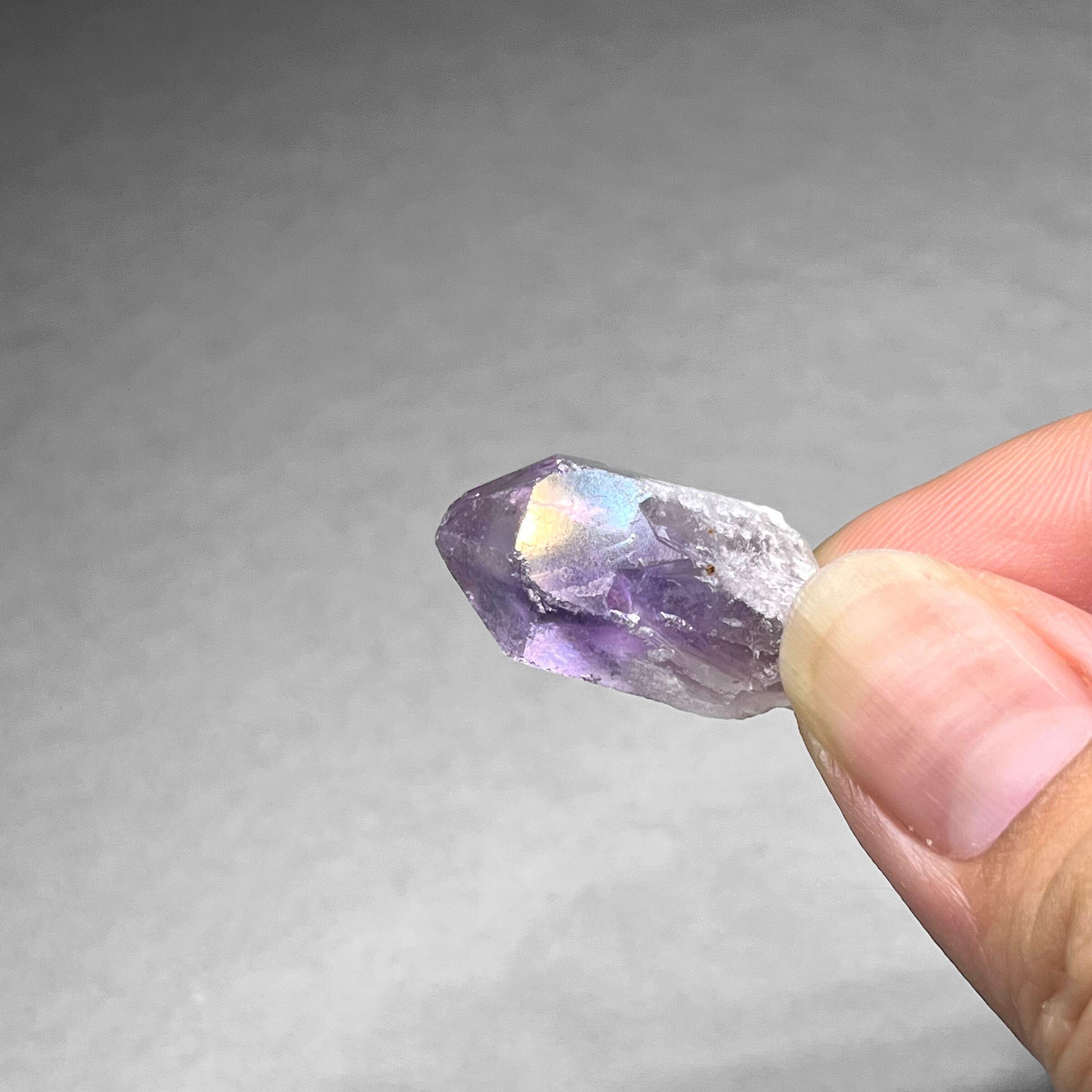 アメジストのポイントは通常小さく短いが、ブラジル北東部のバイーア産のアメジストは通常の結晶よりも長く大きいのが特徴。その柱面はキャンドル状に成長しているものが多く、ポイント先端部にはファントムが確認できる部分も存在する。